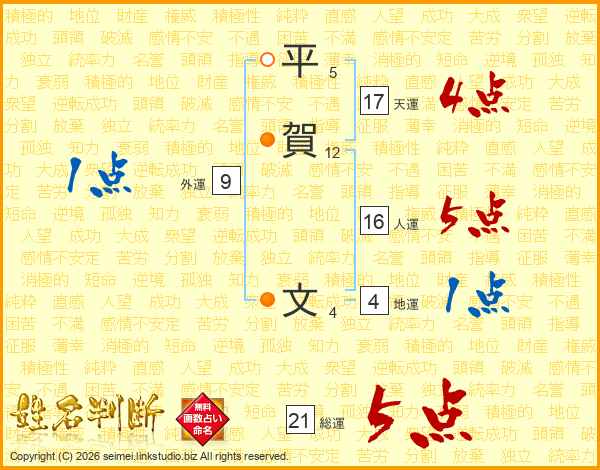 平賀文也 男性 の姓名判断 診断結果 名前の字画数で運勢を占う 無料姓名判断サイト いい名前ねっと